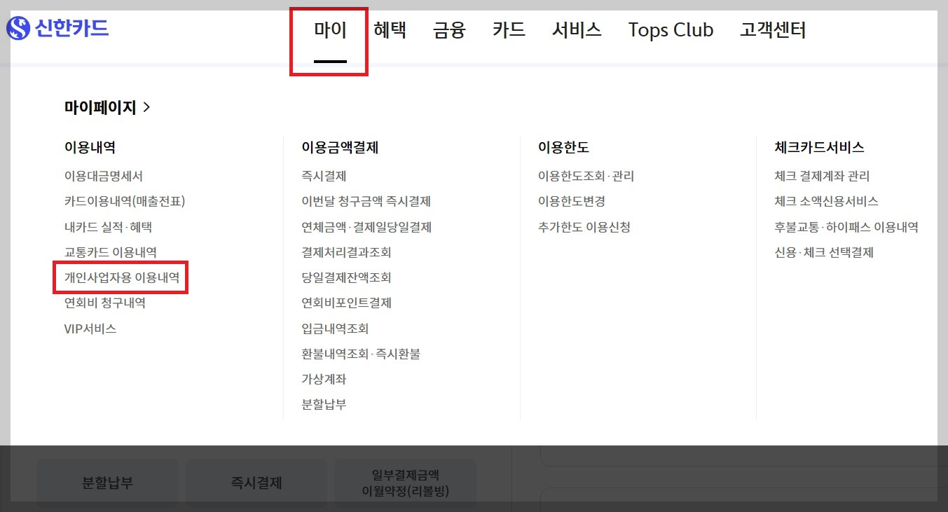1) 홈페이지 메인 화면에서 [마이] 클릭 후 [개인사업자용 이용내역]으로 들어가 주세요.