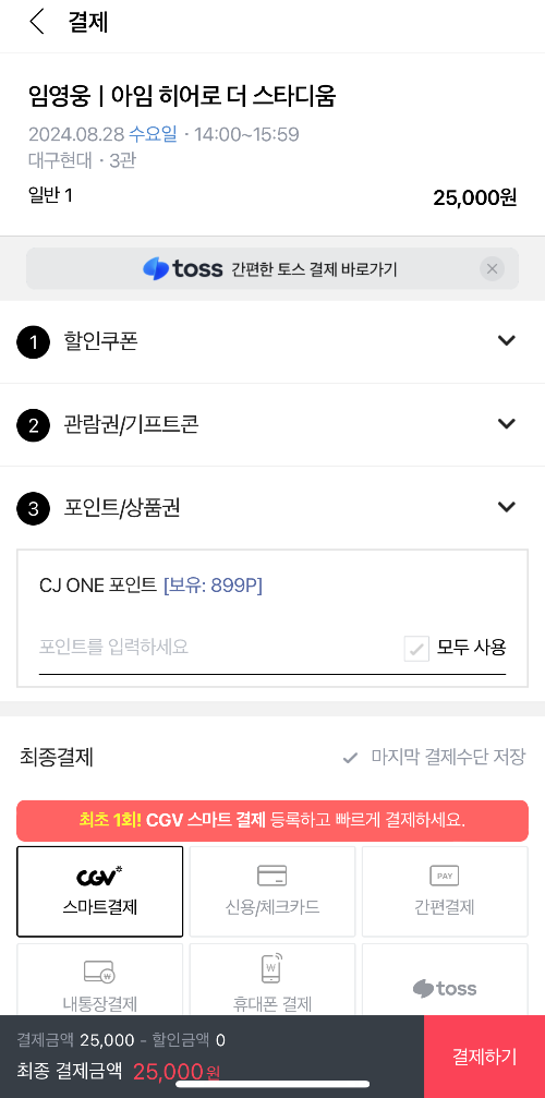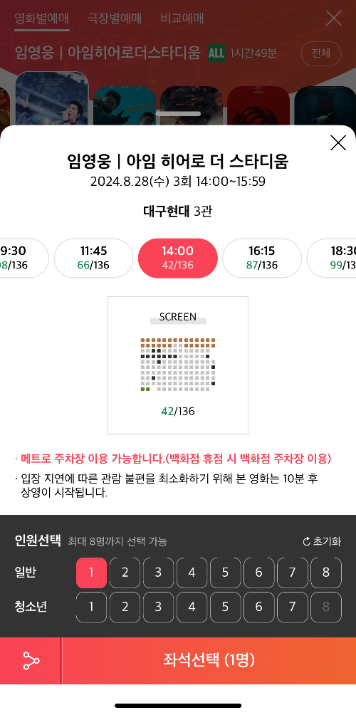 📌 임영웅 영화는 특별 콘텐츠로 각종 우대가, 할인쿠폰, 관람권, 상품권 사용 및 카드사 즉시할인 적용이 제한됩니다.