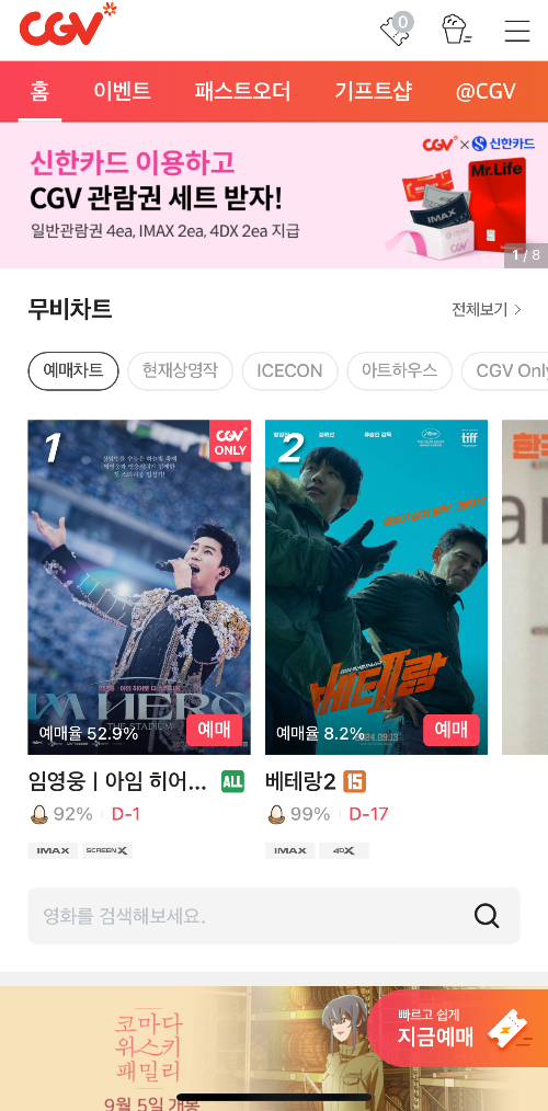 임영웅 콘서트 영화 예매는 CGV에서만 가능합니다. 어플 다운로드하시면 1분 만에 예매 가능하니 아래 내용 확인하시고 바로 예매 진행하세요.