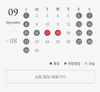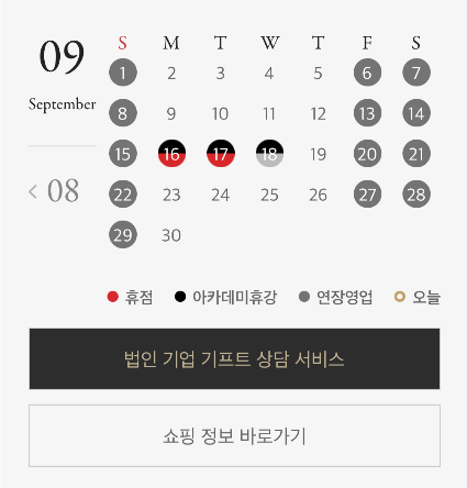신세계백화점 김해점 9월 휴무일은 9월 16일, 17일입니다.