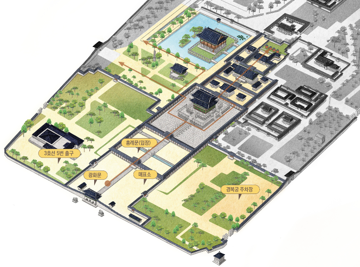 광화문, 홍례문, 경회루, 근정전, 강녕전, 교태전, 사정전, 아미산