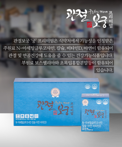 관절보궁 궁 프리미엄은 이러한 성분들을 통해 관절의 통증 완화, 염증 감소, 연골 재생 촉진, 유연성 향상 등의 다양한 효능을 제공합니다. 이 제품은 관절 건강을 유지하고자 하는 사람들에게 특히 유익한 건강기능식품입니다.