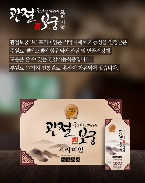 - 액상: 관절보궁 보(MSM 함유) / 60ml 60포 (1일 2회, 1회 1포 섭취)