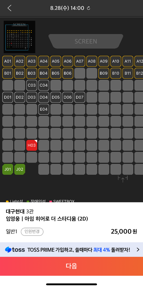 3. 좌석 선택 후 결제 진행하시면 예매 완료 됩니다.