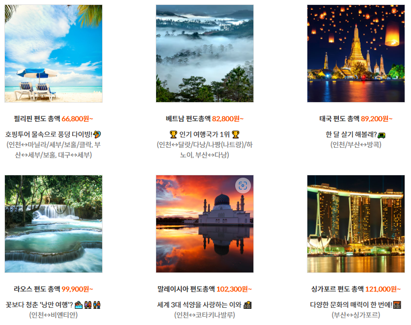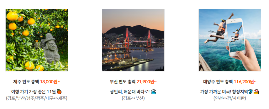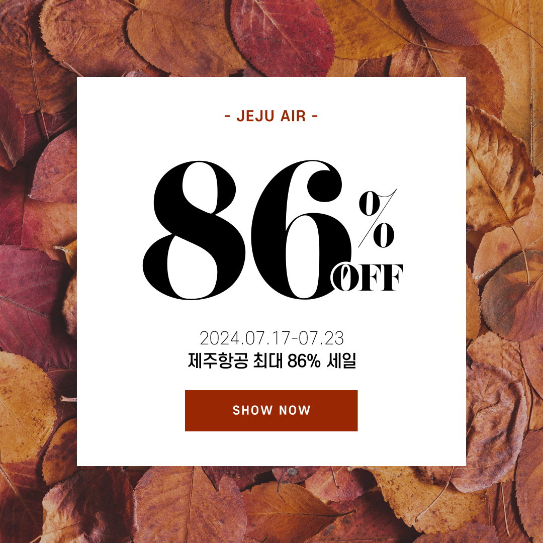 지금부터 가을여행 준비하셔야겠죠? 제주항공에서 11월 출발하는 특가항공권 판매를 시작했습니다. 특히 가을에 여행하기 좋은 제주도 항공권 예매부터 일본, 동남아 등 다양한 여행지의 항공권을 저렴한 가격으로 구입할 수 있습니다. 아래 버튼 통해서 지역, 나라별 특가항공권을 할인코드까지 추가로 받아서 최대 86% 할인된 가격으로 구입하세요.