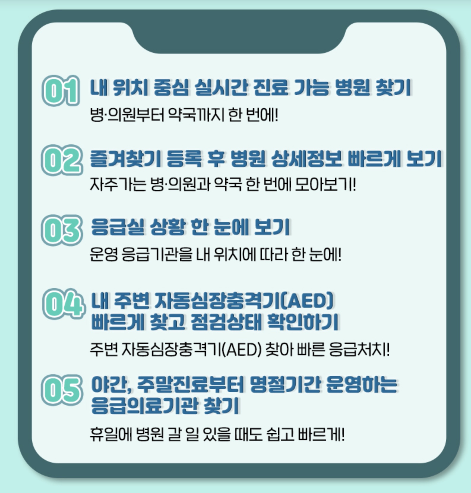 야간진료기관 정보, 자동심장충격기 위치 정보, 응급처리 요령 등