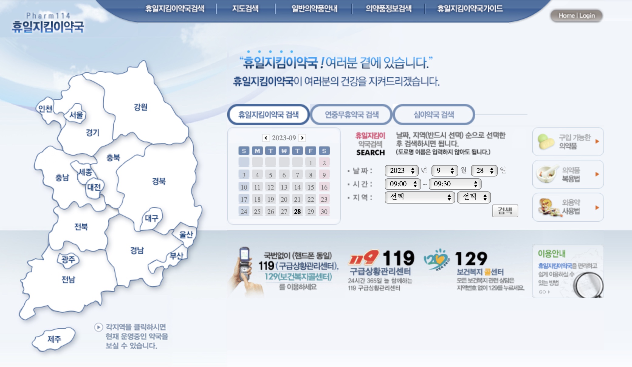 휴일지킴이 약국 사이트 알아 두시면 급하게 약이 필요할 때 아주 유용합니다.