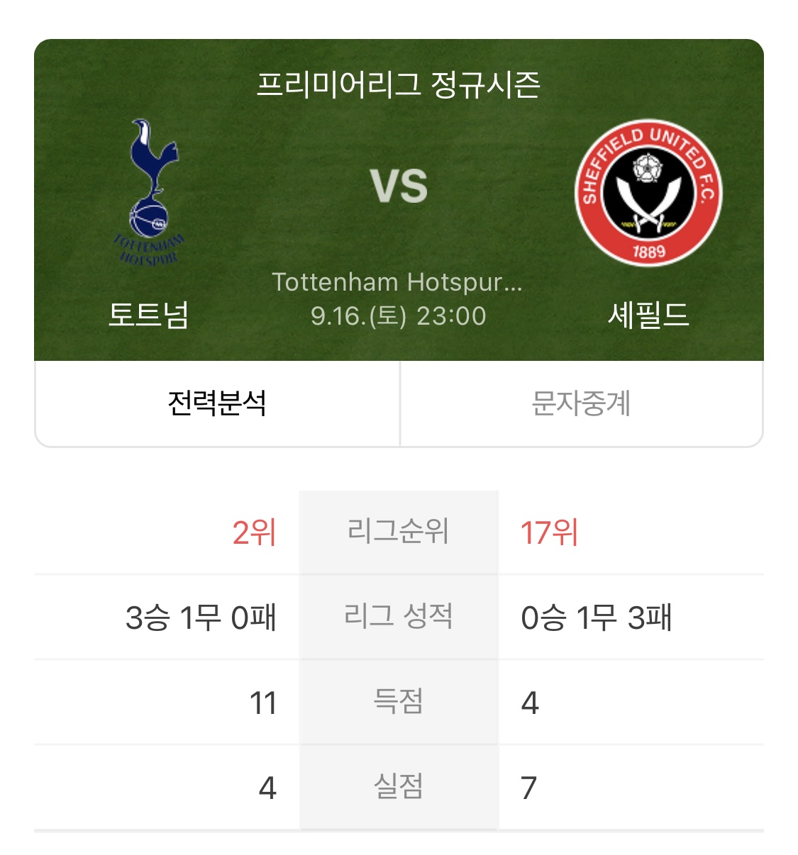 9월 16일 오후 11시 토트넘 홋스퍼 스타디움에서 셰필드 유나이티드와 경기를 펼칠 예정입니다.