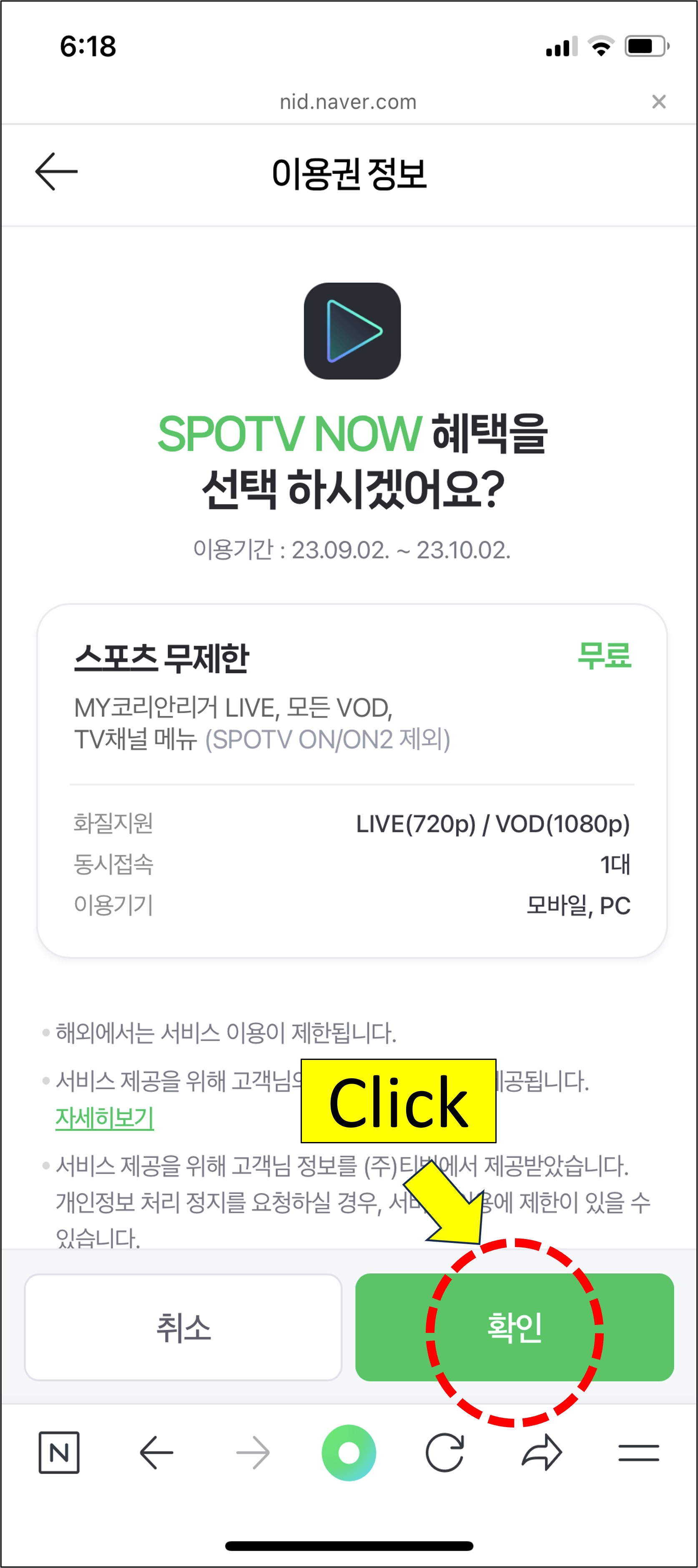 4. 스포티비 선택 후 확인 클릭