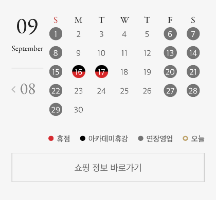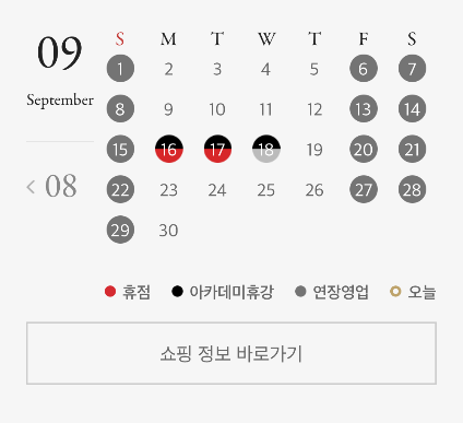 신세계백화점 김해점 9월 휴무일은 9월 16일, 17일입니다.