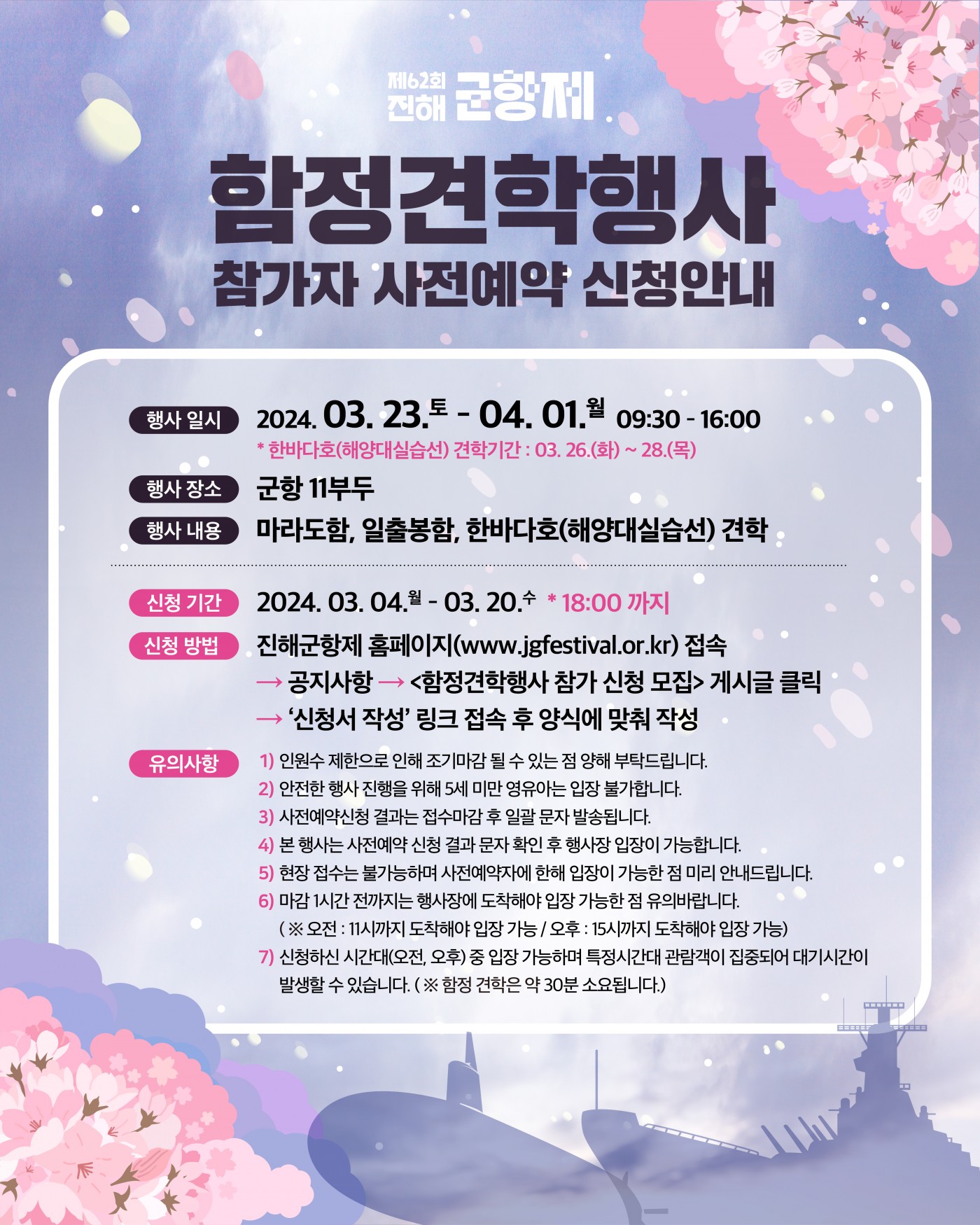 2024 진해 군항제에서는 함정견학행사를 진행합니다. 미리 사전예약 후 견학이 가능하니 지금 바로 사전예약 신청해 보세요.