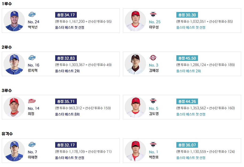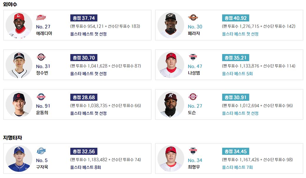 - 외야수: 페라자 / 나성범 / 도슨 / 김현수 / 홍창기