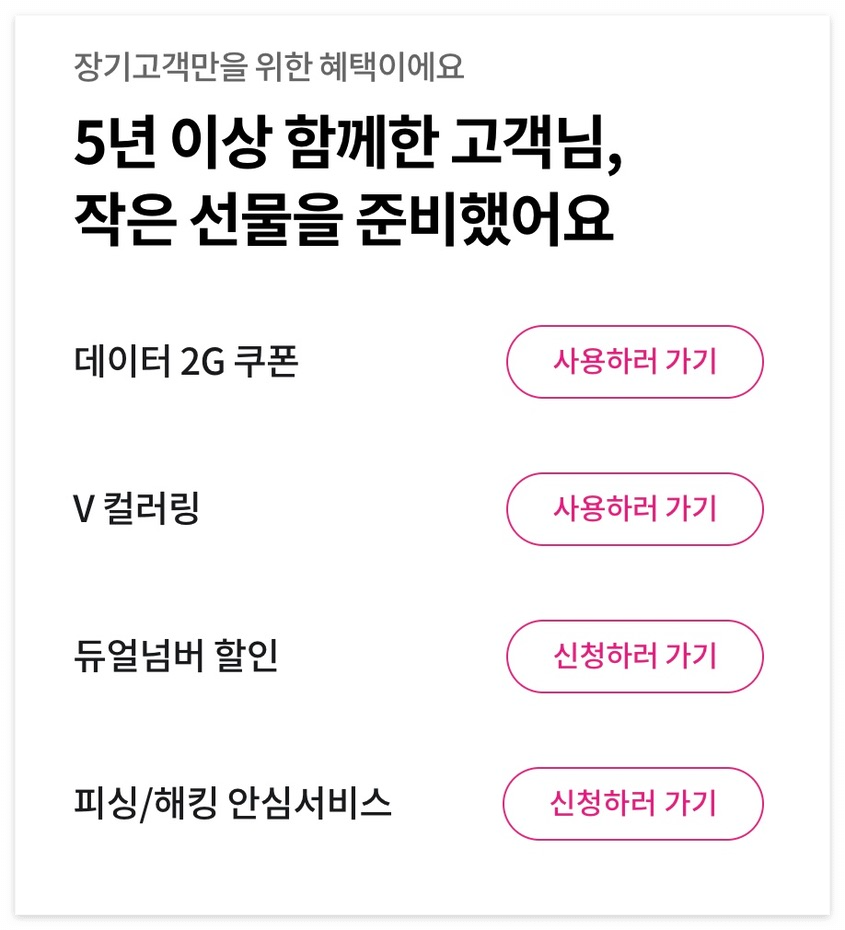 엘지유플러스는 장기 고객에게 다양한 혜택을 제공합니다. 5년 이상 장기 고객에게 주어지는 혜택은 위 사진에서 확인할 수 있습니다.
