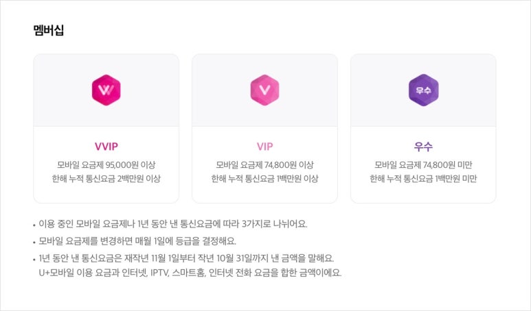 엘지유플러스 멤버십 등급은 요금제 또는 1년 동안 낸 통신요금에 합계에 따라 3가지로 나눠집니다.