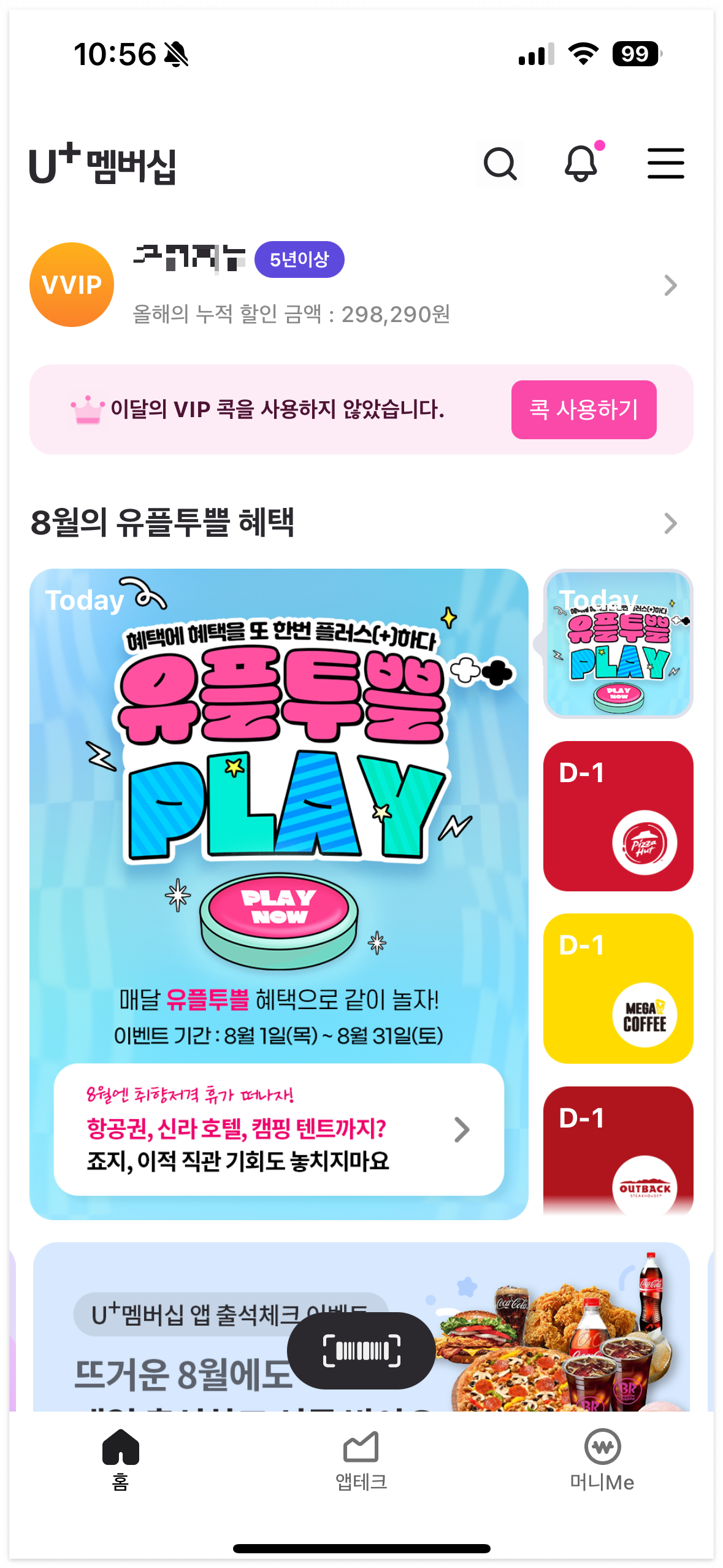 8월 유플투쁠 혜택은 멤버스 앱을 통해서 바로 확인할 수 있습니다. 8월 혜택에도 가장 인기 많은 베스킨라빈스 쿼터 할인 쿠폰이 포함되어 있습니다. 내 등급별 할인 쿠폰은 아래 버튼 통해서 자세하게 확인할 수 있습니다.