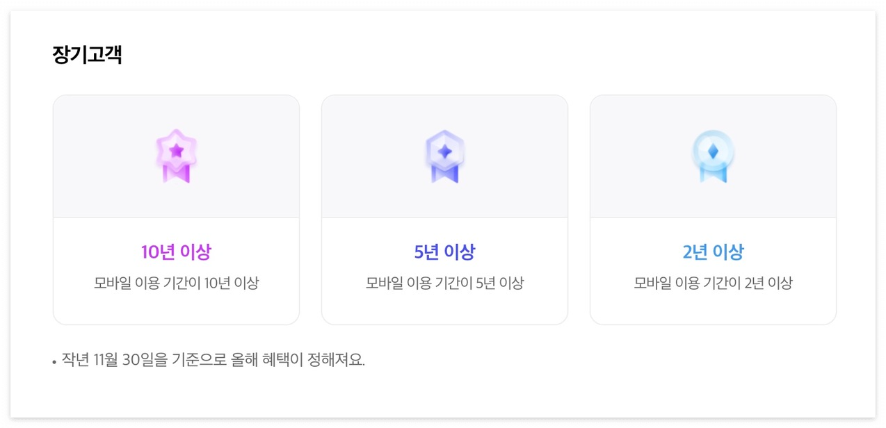 - VIP: 모바일 요금제 74,800원 이상 / 한 해 누적 통신요금 1백만 원 이상